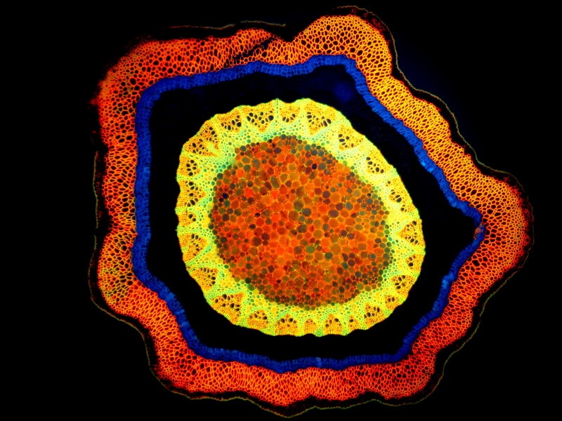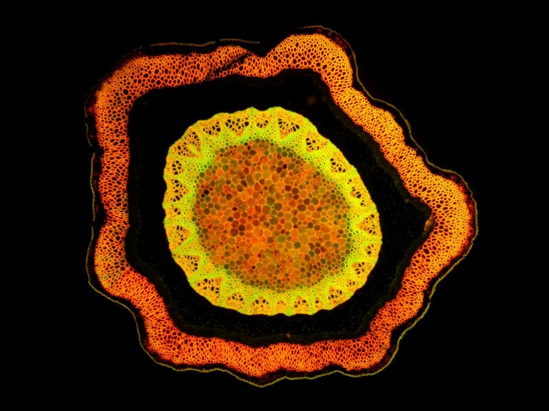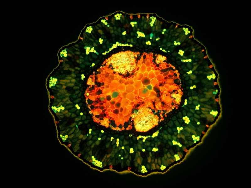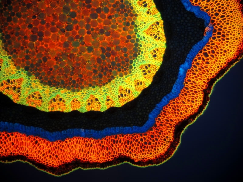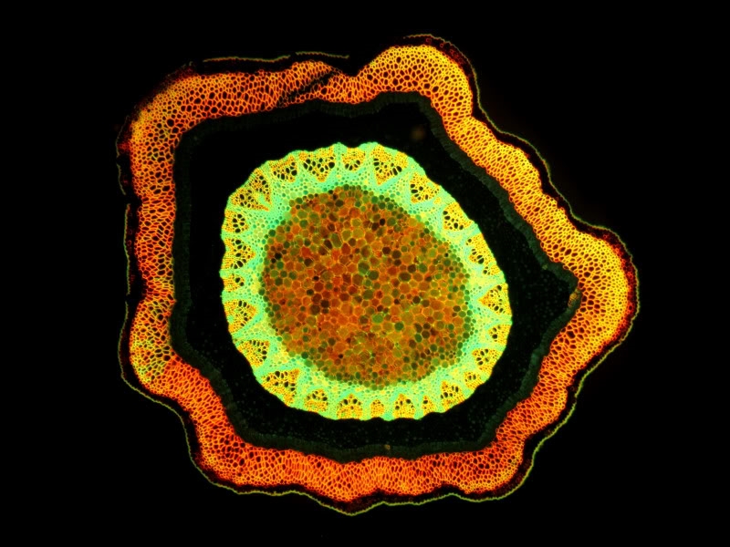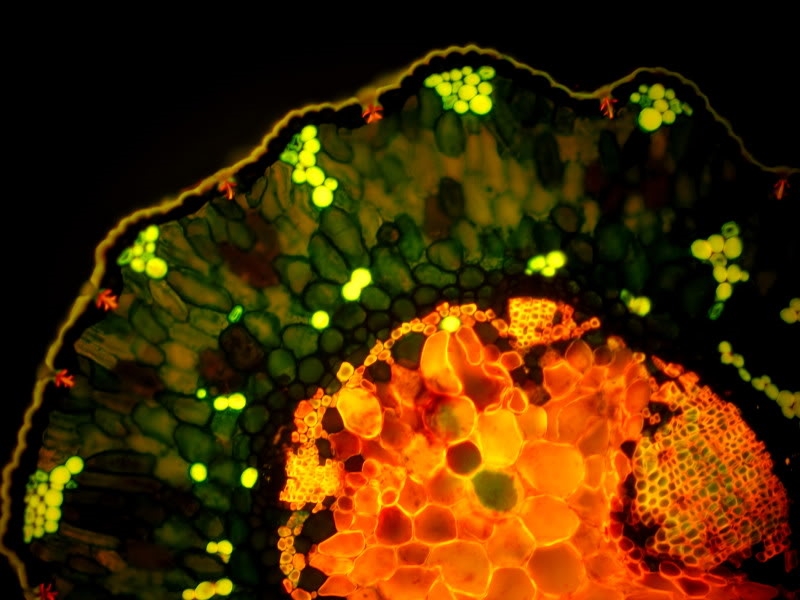 Eine der nachstehenden Bilder zeigt übrigens ebenfalls den Spross unter Fluoreszenz, dieser aber mit Alcianblau gefärbt. Das kommt offensichtlich nicht so gut wie bei Deiner Aufnahme.