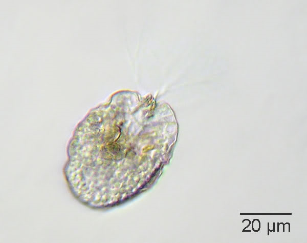 Es ist eine beschalte Amöbe, aus eine "schwierige" und wenig beobachte Gruppe, das Lecythium-Chlamydophrys-Plagiophrys-Pamphagus-Komplex. Deine Amöbe ist wahrscheinlich eine Lecythium-Art und wurde früher auch wohl beschrieben als Plagiophrys scutiformis. Eine vergleichbare Amöbe ist: