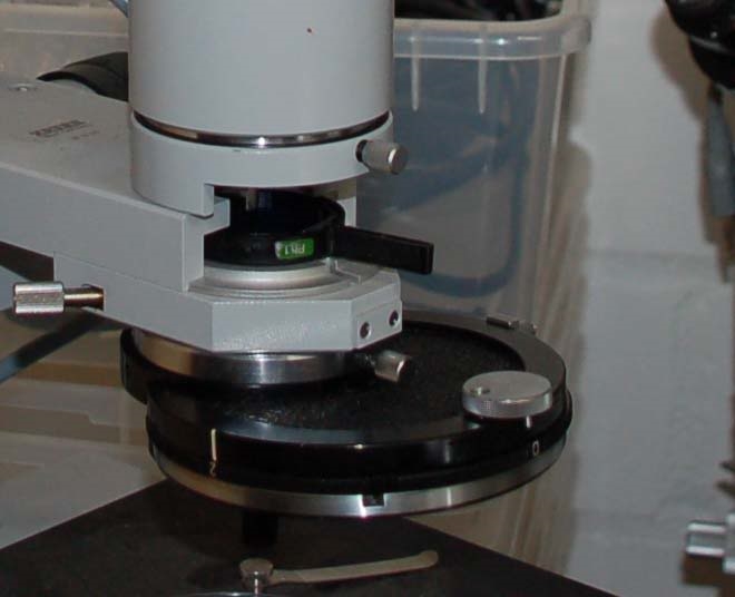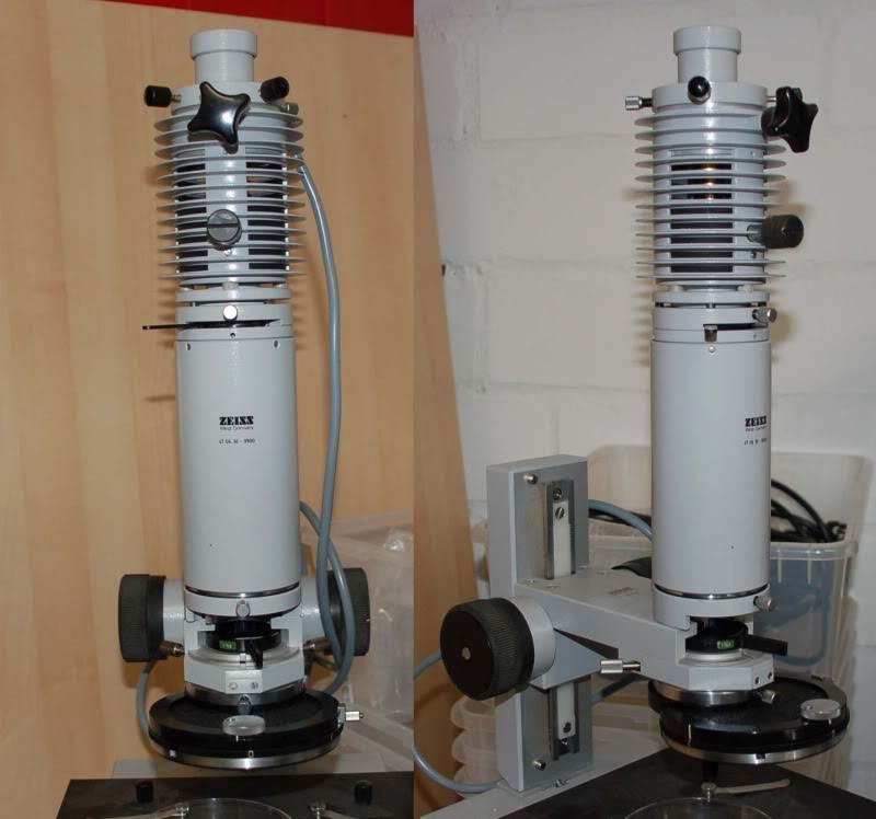 Beleuchtungsseitig hatte es keinen Kondensor. Unten entdeckte ich aber die typische Zeiss-Schwalbe für die Kondensoraufnahme, sodaß mein erster Gedanke war: " Beim Standard-System ist ja fast alles kompatibel, also einfach mal einen normalen Zeiss Ringblendenkondensor einsetzen. Gesagt, getan - allerdings funktioniert es so einfach nicht ( war mir im Nachhnein auch klar  ;) ). So angebracht, projiziert der Kondensor z.B. das Bild einer Ringblenden groß ( Duchmesser abhängig davon, die hoch die ganz Beleuchtungseinrichtung geschraubt wird ), auf den Objekttisch, jedoch nicht in das Objektiv.