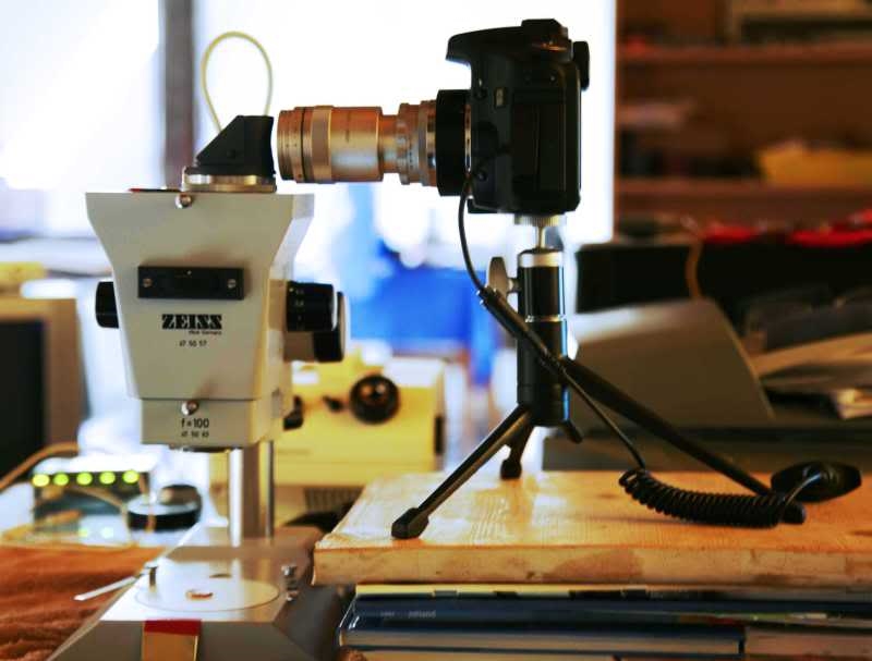 etwa 1,6x kleiner als 24x36mm), montiert auf einem kleinen Stativ von Leitz.