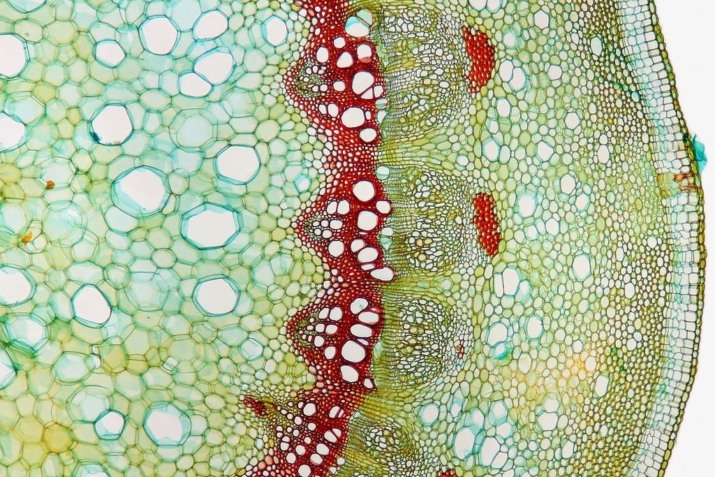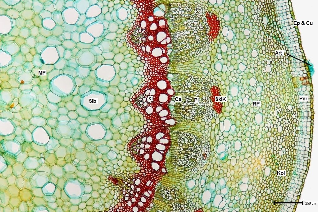 Dann ist der damalige Spross im November "geerntet" worden, also schon in der Ruhephase mit eingelagerten Reservestoffen in den Zellen vor allem des Markparenchyms. Und er zeigt schon ein deutlich weiter fortgeschrittenes sekundäres Dickenwachstum.