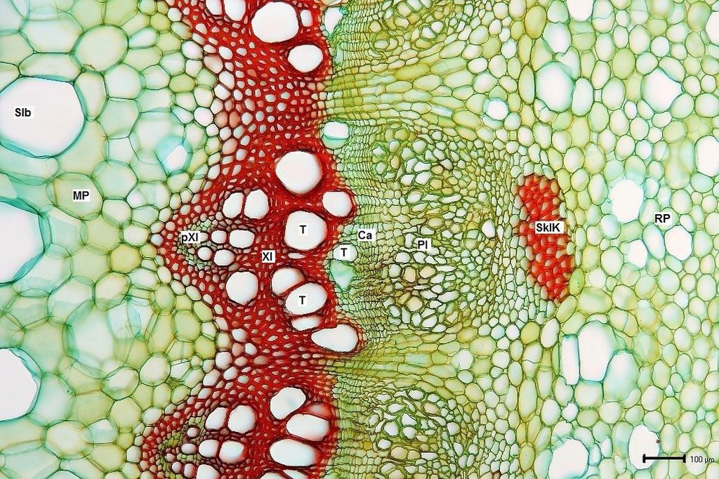 Bild 17a-c: Etwas näher heran: eines der Leitbündel, Bild 17a ungefärbter frischer Schnitt, Bild 17c mit Beschriftung; Vergrößerung 100x, Stapel aus  26 bzw. 19 Bildern