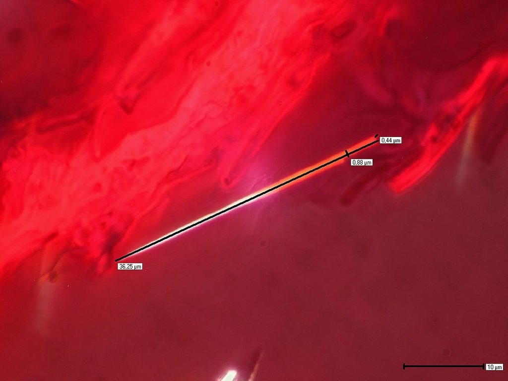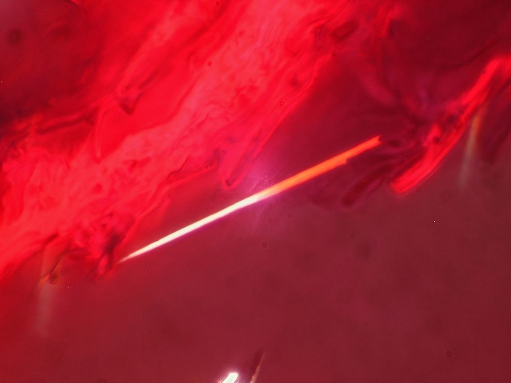 Auch hier liegt das relevante Ende unter einem Gewebestück, es ist aber eindeutig eine Gabelung aus zu machen. Es stellt sich allerdings die Frage, ob es sich um eine angebrochene und eine ganze Raphide handelt, oder ob da eine angebrochene und zwei ganze Raphiden liegen. Ich bin mit meiner Optik da am Anschlag dessen, was ich auflösen kann, zumal meine Kamera bei Polaufnahmen immer einen unschönen Rotschleier drüber zieht.