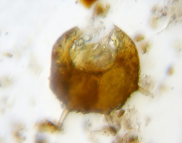 Auffällig sind die regelmäßigen Kanten in der Schale, die ich so bei Centropyxis noch nie beobachtet habe. Entschuldigt die schlechte Bildqualität. Die Schale lag innerhalb einer Gallerte.