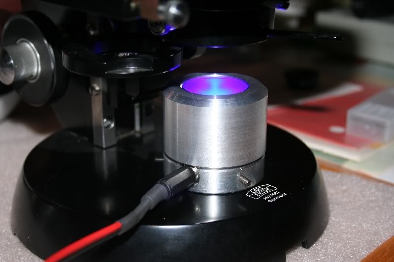 Das ist normal, denn sooo monochrom sind die blauen LEDs auch nicht. Aber wenn der Anregungsfilter, welchen du da auch immer hast, nicht das durchläßt, was die LED größtenteils emittiert, kann auch nichts zum Präparat kommen und es bleibt dunkel. Man sieht es eigentlich schon am Präparat selber, daß es dort kräftig in der Anregerfarbe leuchtet.