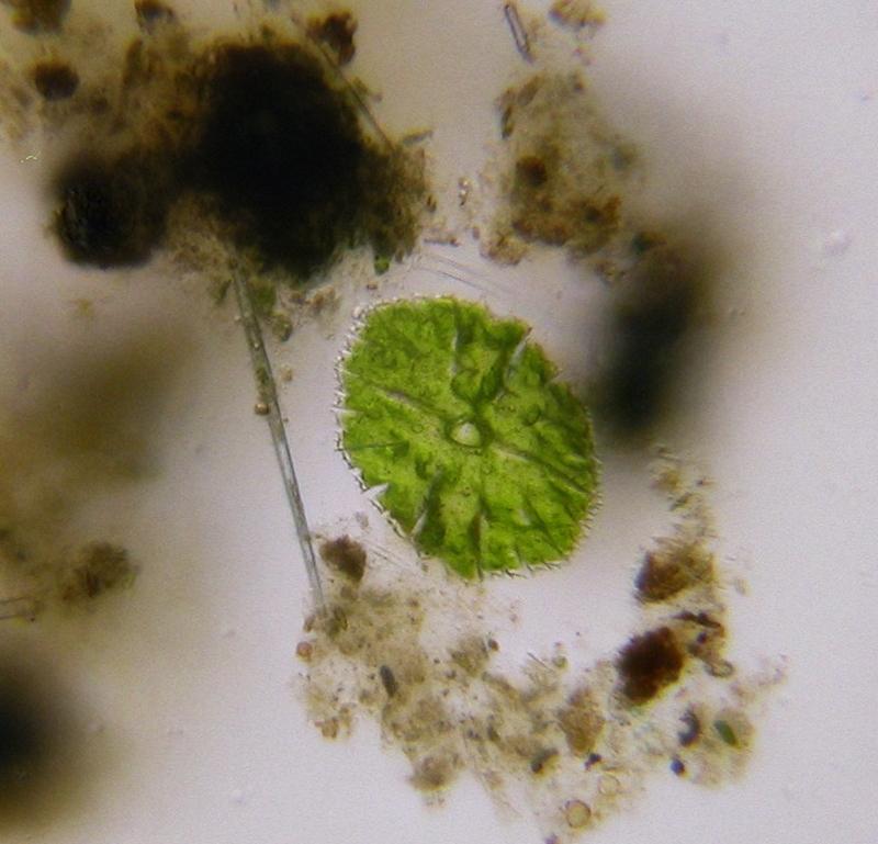 ich habe mir  von Monsti ein paar Tropfen Hochmoorwasser zuschicken lassen und bin zum ersten mal in meinem Leben über einem Wassertropfen gebeugt. Habe da zwischen faserigem Gebilde ein schönes grünes Scheibchen entdeckt und gleich mal meine Schnellwechselcoolpix auf das ate #1939 gesteckt und mit dem 10/0,30 CZJ Apochromaten fotografiert.