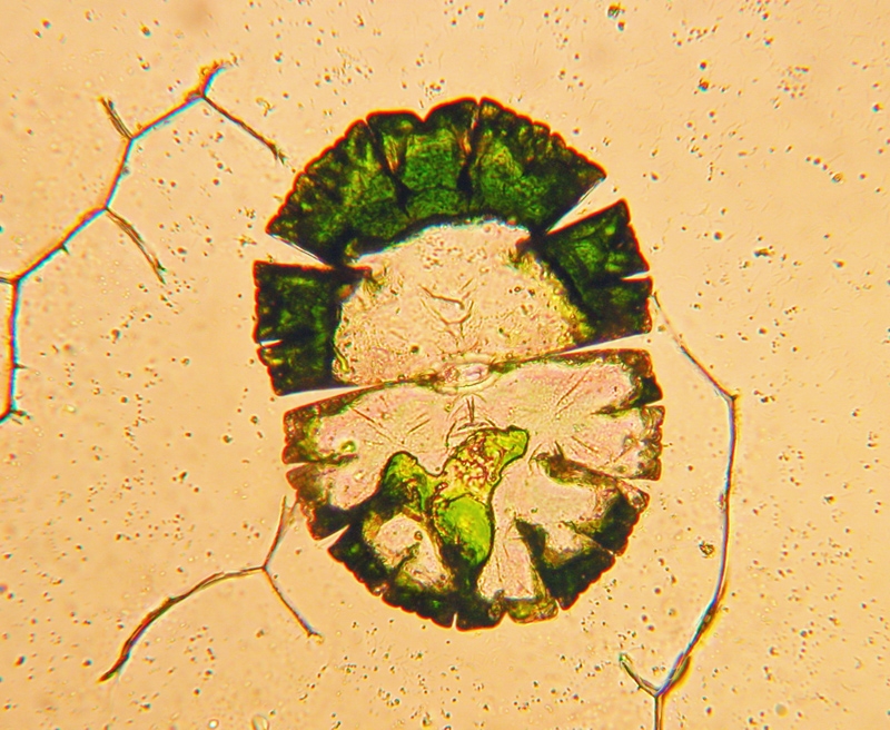 bei beiden gezeigten Micrasterias-Exemplaren  handelt es sich um je eine Zelle, die aus zwei Halbzellen besteht. In der Mitte befindet sich der Zellkern. Es handelt sich um keine Vermehrungsphase.  Beim hier gezeigten Exemplar könnte es sich um M. denticulata handeln.