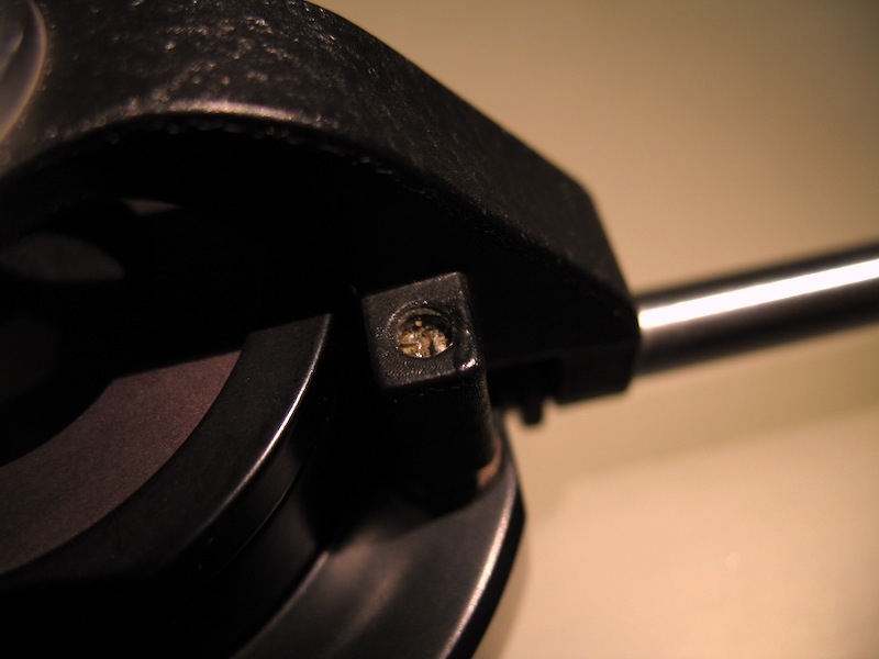 Ich habe mir das Adapterrohr angesehen welches die Ringschwalbenaufnahme ja auch nur mit drei Gewindestiften am Rohr festhält. Das ist mechanisch eine reichlich lausige Lösung, da die Leuchte 60 doch einiges an Hebelwirkung an diesen Alumininiumteilen ausübt. Das Ganze hat überall ein wenig Spiel und ist nicht im mindesten überzeugend. Allerdings muss man auch sagen dass der Lichtaustritt vergleichsweise unverändert bleibt, selbst wenn man die Leuchte um 10-15º aus der Lichteinfallsachse verkippt.
