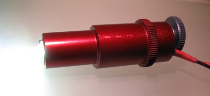 Der Regler ist am hinteren Ende der LED Fassung angebracht. Regelung erfolgt per PWM bei 1 MHz und ist in der Fassung untergebracht, da ein längeres Kabel bei einem Megahertz wohl durchaus als Funkantenne fungieren würde, was natürlich nicht erlaubt ist  8)