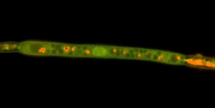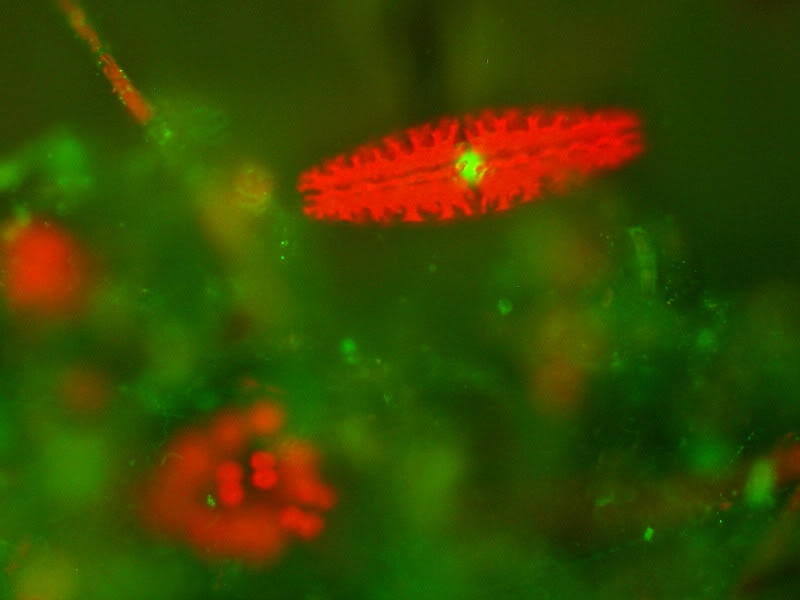 Vor 2 jahren hatten wir auf Wohldenberg Fluoreszenzaufnahmen von Zieralgen gemacht, die mit AO angefärbt wurden. Auf die Schnelle habe ich dieses Bild in meinem PB-Album gefunden