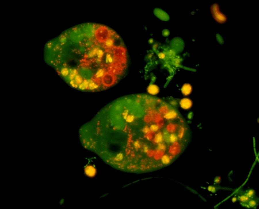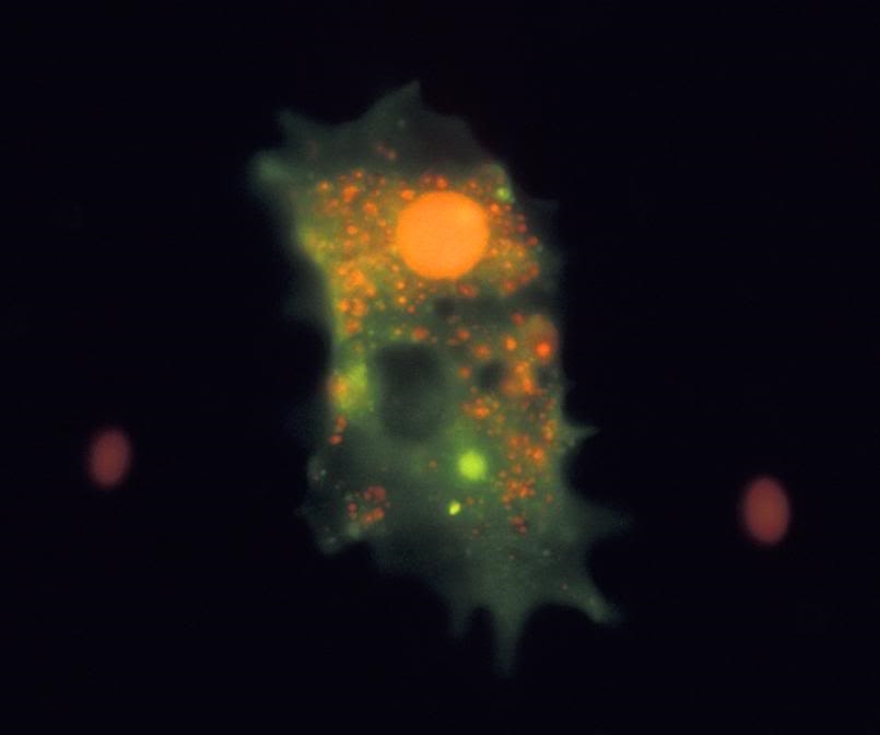 Die folgenden 2 Bilder zeigen Amöben im Lebendpräparat, Farbstoff: Acridinorange, Blau-Anregung