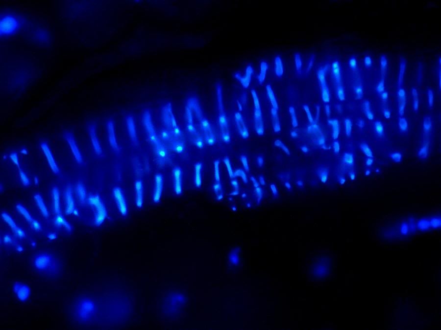 Als Lebendfarbstoff gehe ich genau so vor wie mit Acridinorange in meinem vorigen Beitrag beschrieben. Ich tauche die Spitze einer Präpariernadel in die DAPI Stammlösung und übertrage nur winzige daran klebende Tröpfchen in die Frischprobe auf dem Objektträger und warte - hier ca 5 min. Man sollte immer bei etwas reduzierter Beleuchtung arbeiten.
