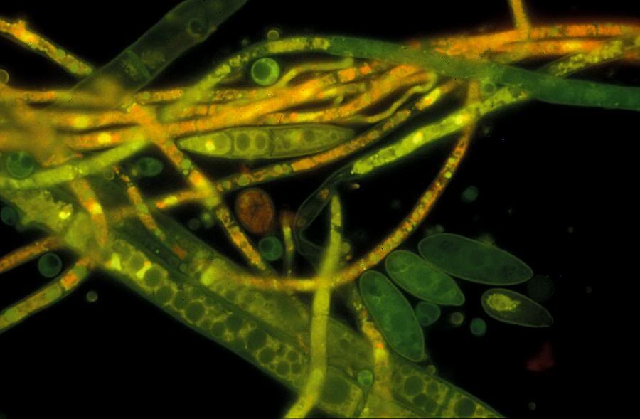 Die folgenden 3 Bilder zeigen Pilzhypen im Lebendpräparat, Farbstoff: Acridinorange, Blau-Anregung