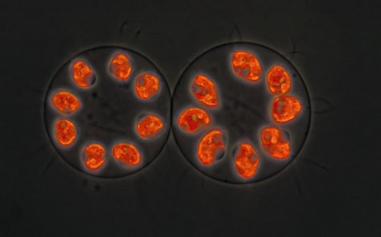 Zwei Individuen von Stephanosphaera pluvialis Cohn, Durchlicht Phaco mit simultaner Auflicht Fluoreszenz, Eigenfluoreszenz des Chlorophylls, Blau-Anregung