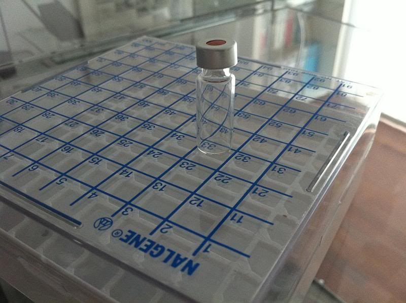 DAPI kaufe ich in kleinen Mengen, es ist teuer aber sehr ergiebig. Ich löse 1 mg in 1 ml dest Wasser und fülle das dann 50 µl-weise in kleine Crimp-Flaschen (siehe Bild) ab, die ich dann sofort einfriere (das Rack mit den Fläschchen umwickele ich zum Lichtschutz noch mit Alufolie). Ich habe festgestellt, dass diese Stammlösung jahrelang hält.