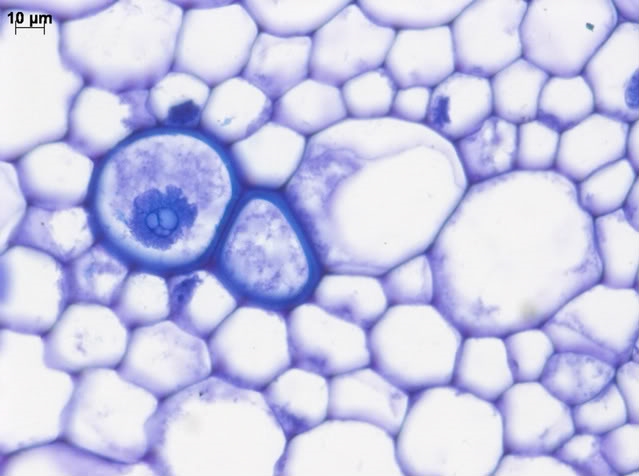 Klaus' Vorschlag mit der Polarisationsmikroskopie ist gut, das Ergebnis, zusammen mit dem Erscheinungsbild, zuverlässig. Aber ist das denn so wichtig? Es handelt sich um Cytoplasma in zwei Tracheen, die demnach noch nicht voll ausdifferenziert sind. Und dieses gelappte Gebilde in der linken Zelle ist mit Sicherheit kein Kern, sondern sehr wahrscheinlich Stärke. Das sollte doch genügen. Oder, wie ist denn das Thema Deines Referates?