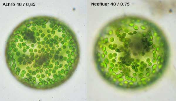 Was Lothar meinte ist, dass bei dem Bild, das Du mitdem Neofluar aufgenommen hast, die Alge kugeliger wirkt im Vgl. zu dem Bild mit dem Achromaten; und er mutmaßt, dass dies an einer stärkeren Bildfeldwölung liegen könnte.