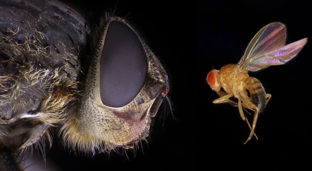 Es handelt sich um die Gegenüberstellung einer Stubenfliege mit einem Drosophila Weibchen.