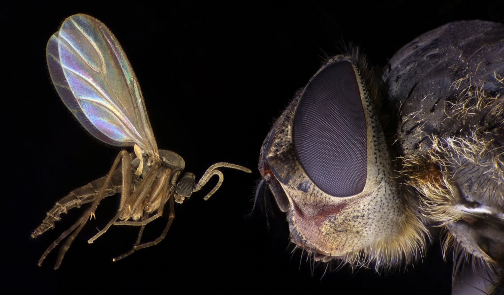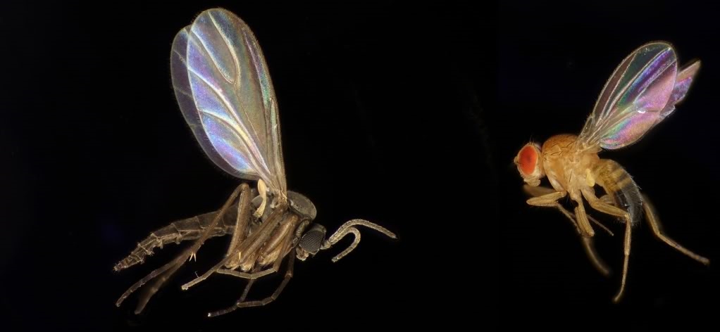 Trauermücke in Gegenüberstellung mit einem Drosophila Weibchen.