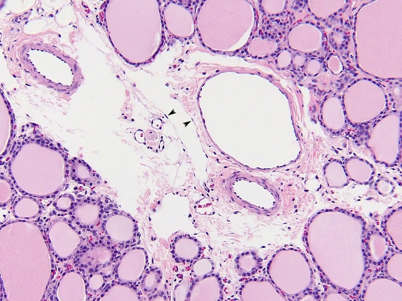 Schau mal hier, zwei Pfeilpunkte, wie scharf das feine Endothel von ein Lymphgefäß dargestellt wird.