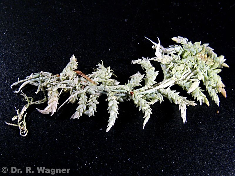 - Habitus. Herbarmaterial. Sektion Spagnum. Pflanzen rein grün, kräftig. Stammepidermis 3 -4 schichtig. Äste in Büscheln zu 4-5, davon 1-2 hängend. Chlorocyten im Querschnitt oval mit Papillen an den Außenwänden, mittig zwischen den Hyalocyten.