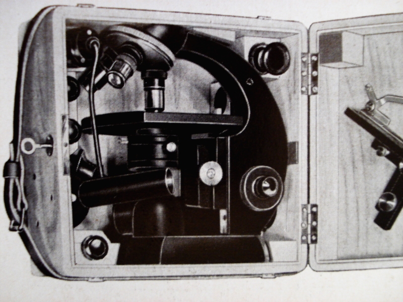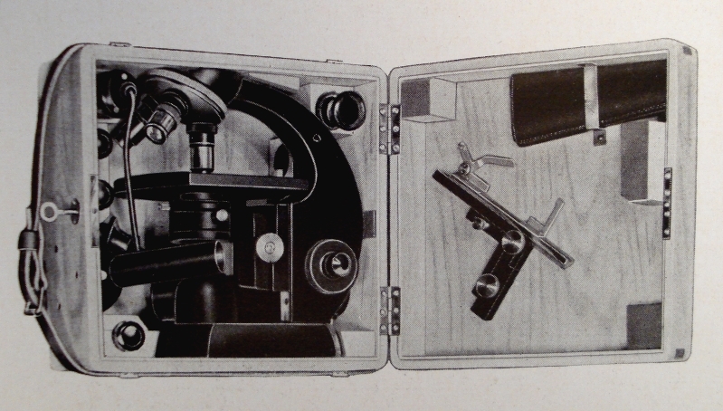 Neben diesem relativ großen "Gullideckel" gab es auch noch einen mit rund 5 cm Durchmesser. Die einzige mir bekannte 'offizielle' Erklärung für diesen Durchbruch ist der Einsatz als Mikroprojektionsgerät, bei dem das Stativ auf der Lichtquelle befestigt wird. Im Fuß wird dann ein spezieller Kollektor mit Lichtschutz. Eine weitere Anwendung habe ich einmal erzählt bekommen: Ohne den 'Gullideckel' konnten die Stative auf einen Leuchttisch gestellt werden, um schnell Präparate bei geringer Vergrößerung zu durchmustern.