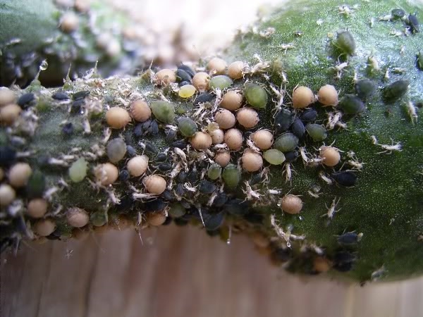 Die hellen kugelförmigen Gebilde sind die Mumien. Die grünen und die dunklen Tiere sind noch gesunde Läuse.