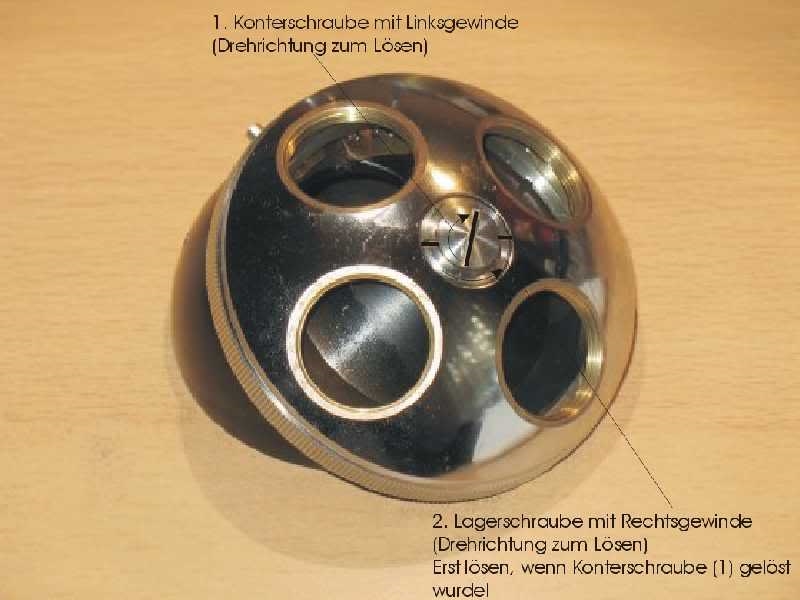 Bei meinem Junior-Revolver hatte die mittlere Schraube auch ziemlich fest gesessen, aber es geht auch ohne den Fats mit den zwei unbrauchbaren Objektiven. Man lege den Revolver mit der Ringfläche auf den Tisch und löse die Schraube durch Rechtsrehung unter kräftigem Druck. Abstützen ist also erlaubt, allerdings nicht unbedingt mit 2 Tonnen Presskraft ::). Abrutschen wäre auch nicht so gut...