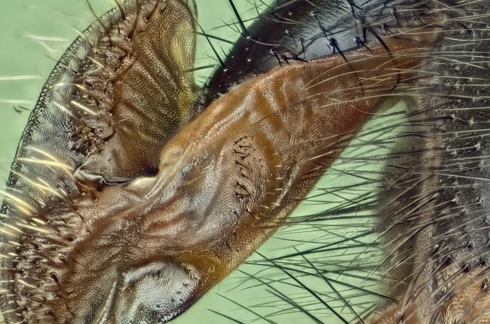 Das Bild wurde mit der 7D und Stackshot über Zerene Stacker aufgenommen. Im RAW-Konverter war die gesamte Schärfung ausgeschalten, im Photoshop wurde das Ergebnis leicht geschärft, sonst aber nicht behandelt! Die Stacking-Fehler in der Kontur sind deutlich sichtbar, es ist ein unbearbeitetes Bild!!! Der Stack besteht aus 70 Bilder, es wurden die im Phase One RAW-Konverter unbearbeiteten Bilder entwickelt und im Zerene mit der Methode P-MAX berechnet ==> die einzige Änderung, ich habe die Bildreihenfolge festgelegt (er wollte die andere Richtung) ...