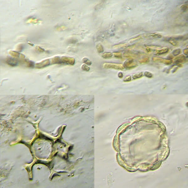 Was sind das z.B. für kleine grünliche Kügelchen im ersten Bild? Könnten es Stärkekörnchen sein? Die Probe war voll davon. Die wie Oscillatoria wirkende Ketten (nur viel kleiner) sagen mir auch nichts. Auf dem dritten Bild der Collage dürfte wohl der Rest von irgendwelchen Kräutern sein, oder? Und was bitte ist auf dem nachfolgenden Foto zu sehen???