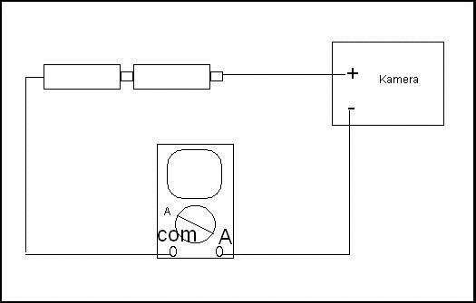 Wenn Du wissen möchtest, wieviel Watt ( oder Strom ) die Kamera benötigt, schalte wie folgt: Schalte 2 frische Batterien, die üblicherweise in das Batteriefach hineingehören, irgendwie hintereinander. Dann baust Du einen Stromkreis so, wie hier aufgezeichnet, stellst auf den Amperemeßbereich und schaltest die Kamera ein bzw. in die verschiedenen Modi. Dann siehst Du doch, wieviel Strom sie "zieht". Sind es mehr als 0,78 A, dann ist klar, wieso die Kamera sich ausschaltet.