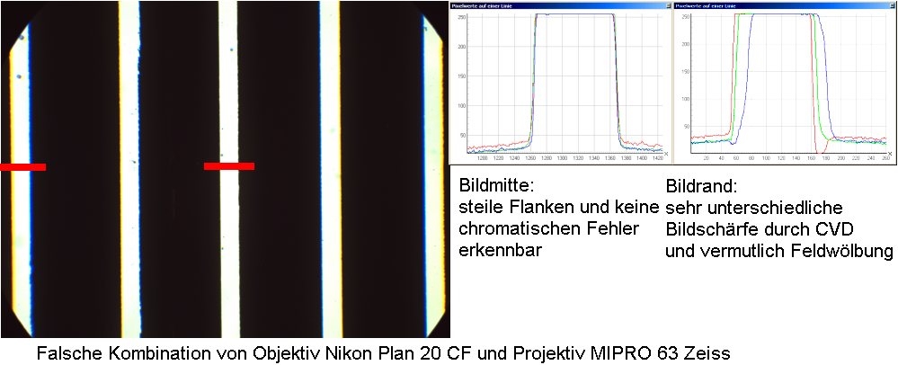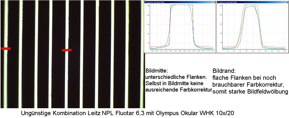 Nur eine Frage. Gibt es für solche Testplatten einen Bedarf?  Es ist ein "Eigenbau" auf der Basis eines versilberten Deckglases, welches dann in einer Vorrichtung mit einem Hartmetallstift mäanderförmig mit Linien im Abstand von 200µm +/- 5µm geritzt wird. Es kann damit sehr gut der Hell-/Dunkelübergang analysiert werden (chromatische Fehler), eine Verzeichnung erkannt und im Randbereich die CVD gesehen werden. Im Gegensatz zu einem Objektmikrometer mit dunklen Strichen auf hellem Grund, fallen die Fehler stärker auf. Das Feld beträgt >= 8mm.