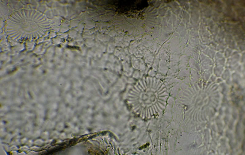 Ja, um zum Thema zurück zu kommen, hier noch ein Stück Oberhaut der Bromelie mit vier Stellen, an denen die Stiele der Saugschirme angesetzt waren: