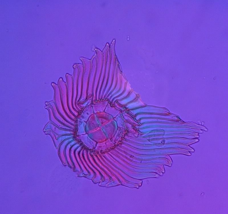 ich habe auch ein Bild im pol. Licht (mit Polystyrolscheibe zusätzlich) probiert. Es ist nicht so schön bunt geworden, warum auch immer. Ich wollte es garnicht zeigen weil sich ein störender heller Fleck etwa in der Mitte  abbildete (vermutlich irgend eine Lichtquelle, die sich einspiegelt?). Den Fleck habe ich außerhalb des Schirmhaares mit dem GIMP-Fotobearbeitungsprogramm entfernen können, aber im Inneren ist die helle Stelle noch sichtbar. Stört da aber nicht so sehr.
