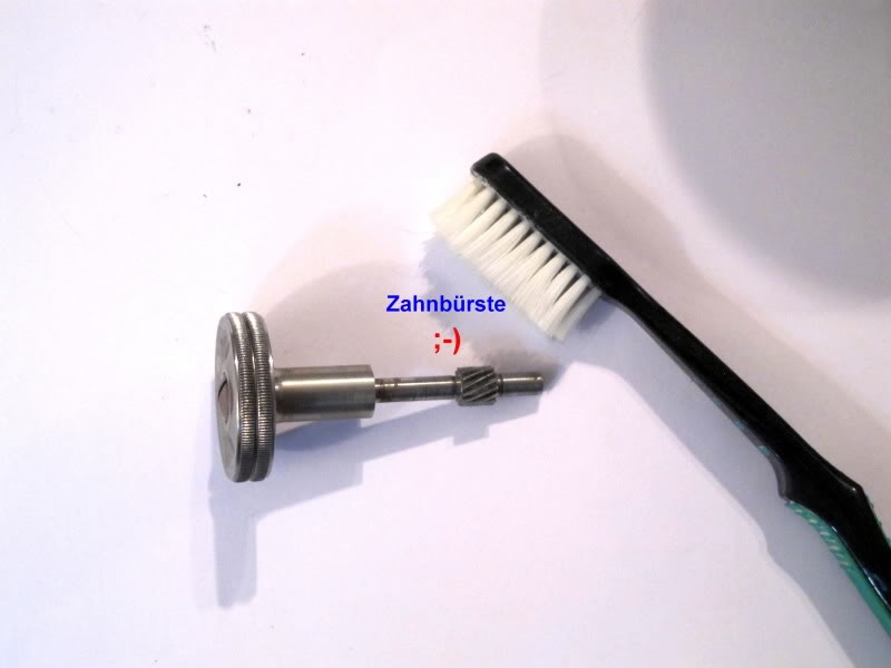 Dabei habe ich mehr oder weniger viele zermahlene Objektträger gefunden. Der Kondensortrieb war richtig blockiert. Da alle Tricks nicht zum gewünschten Ergebnis führten, habe ich mit der Zerlegung begonnen. Dabei habe ich gelernt, dass der Tisch mit 3 Schrauben am Tischträger befestigt ist. 1 +2 sind leicht zugänglich und schnell entfernt. Danach lässt sich der Tisch um eine Mittelachse verkippen, Ich dachte, dass er verstiftet ist, aber selbst kleine Schläge mit dem Hammer (mit aufgelegter Kunststoffplatte als Schutz vor Beschädigung) haben nichts bewegt. Ich wollte diesen "Stift" sehen und habe die Führungsschiene für die Kondensor-Verstellung abgeschraubt. Dabei habe ich noch rechtzeitig erkannt, dass es kein Stift, sondern eine Schraube ist! Das Ritzel und die Zahnstange waren verkrustet von zerriebenem Glasgrus. Reinigung in Xylol enfernt nur das Fett. So habe ich mit warmer Seifenlauge und meiner Lieblingszahnbürste wieder eine funktionsfähige Höhenverstellung des Kondensors  erhalten.