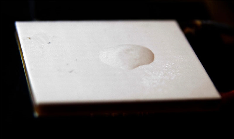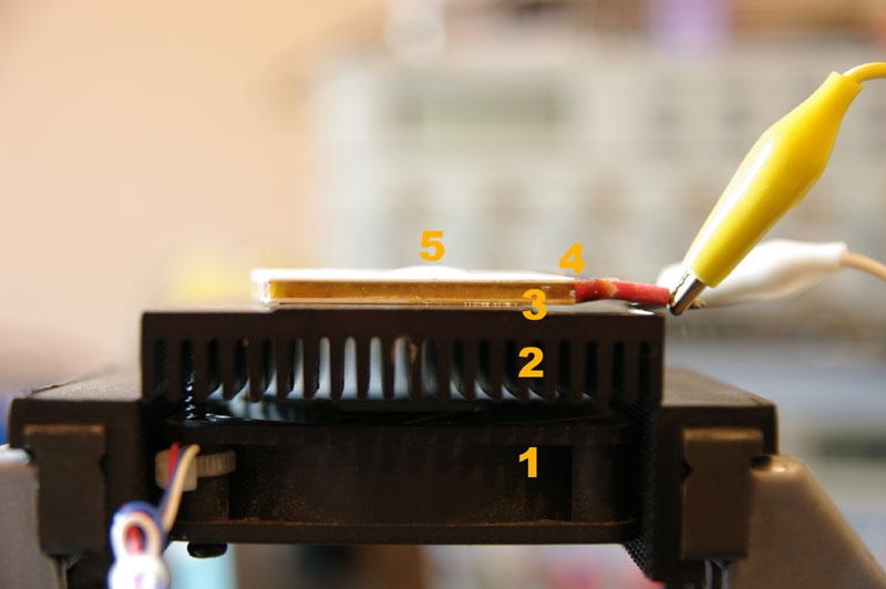 Das Element (4) liegt auf einem alten Grafikkartenkühler (2) der von einem ebenso betagten Lüfter (1) gekühlt wird. Die thermische Anbindung geschieht durch einen Tropfen Immersionsöl (3). Eine vernünftige Wärmeleitpaste ist da vielleicht sogar noch besser ;-) Aber wie man sehen kann, hat sich ein Tropfen Wasser in einen Eistropfen verwandelt (5). Nach dem Auftropfen gefriert das Wasser in wenigen Sekunden. Das Element fühlt sich eiskalt an und der Kühlkörper hier wird kaum merklich warm.