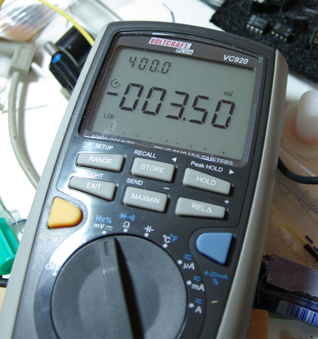 Und die dazugehörige Temperatur (1 mV = 1 °C). Bei 11 Watt ergibt das eine Kühltemperatur von -4 Grad, oder einem Temperaturunterschied von ca. 30 Kelvin. Das ist für die gegeben Umstände sehr ordentlich.