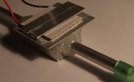 Schöner als das mit Heißkleber geklebte Alu-Teil ist natürlich etwas Professionelles aus dem PC-Wasserkühler-Sektor, aber da gab es nichts was zum Peltier-Element passt und klein genug ist für die Halterung des Mikrotoms.