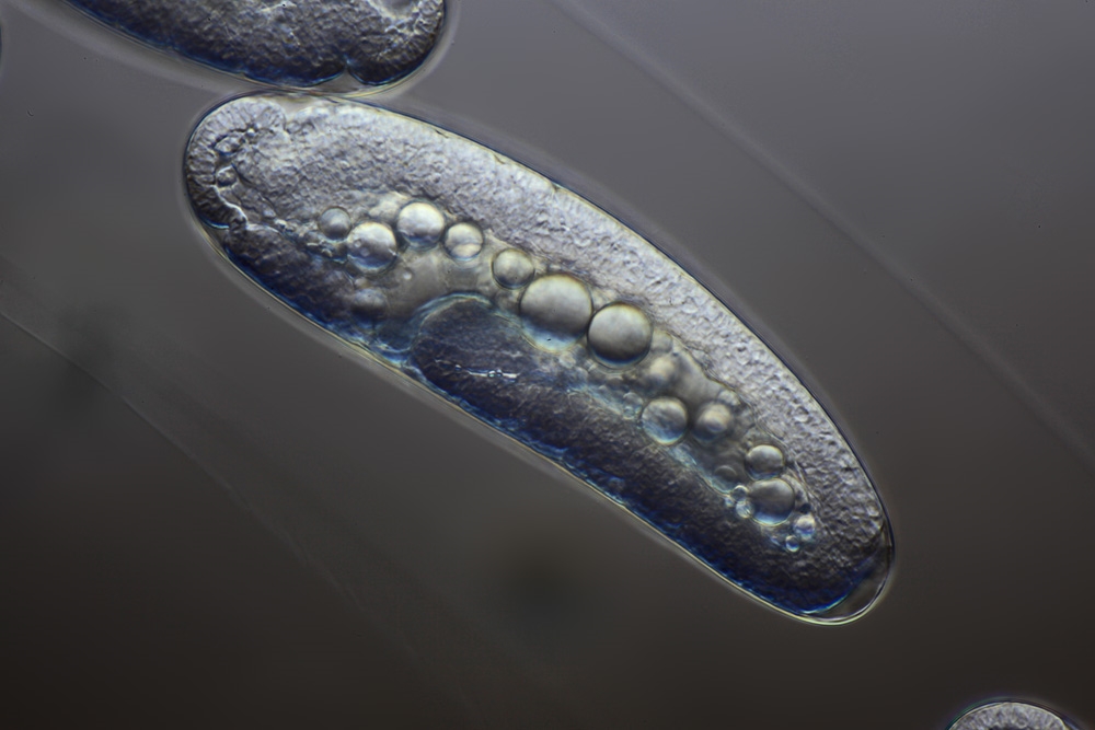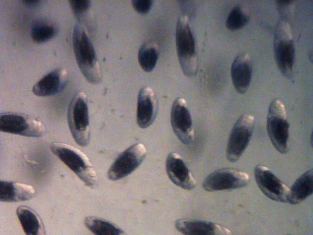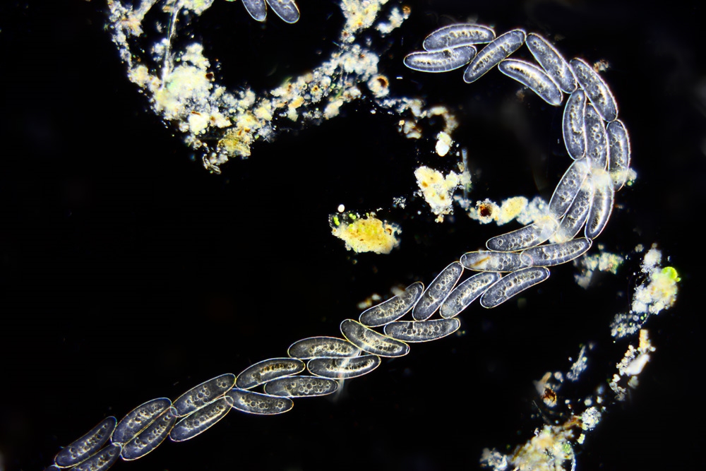 Die einzelnen Objekte/Eier sind ca. 120 µm bis 150 µm gross und sind in einem "klebrigen" Schlauch untergebracht.