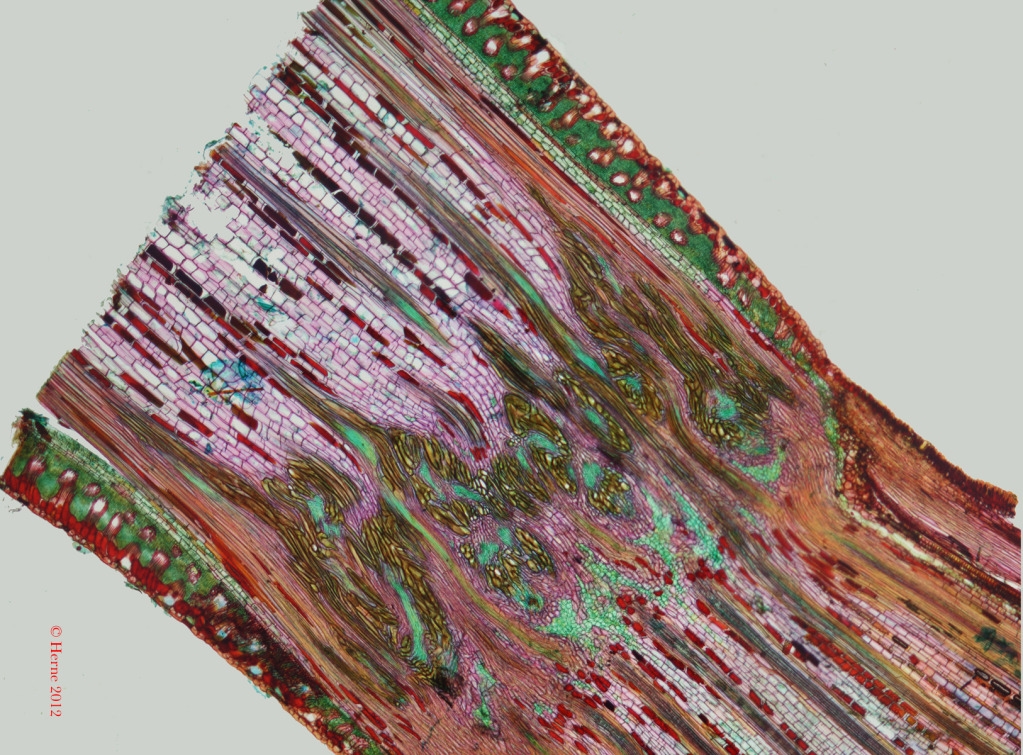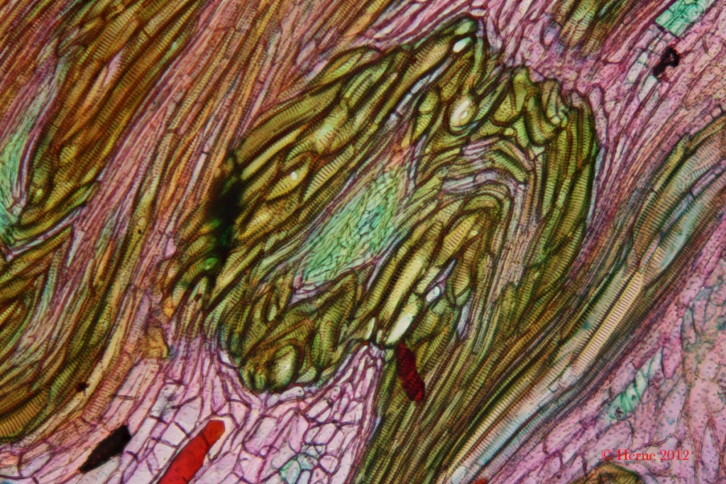 Um ein paar neue Techniken zu üben habe ich die quer und längs scheiblettiert. Schnitt-Dicke dabei ca. 50 µm. Anschließend wurden die Scheibchen in R.D. Müller´s einstufiger Wackerfärbung behandelt und in Euparal eingedeckt.