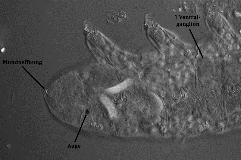 Hier einige Aufnahmen von einem Baertierchen. Stammt aus einer aelteren Tuempelprobe. Das Baertierchen auf den Photos liegt auf der Seite; Ventralseite ist sichtbar. Ich habe versucht einige anatomische Details zu beschriften; Ergaenzungen sind willkommen.