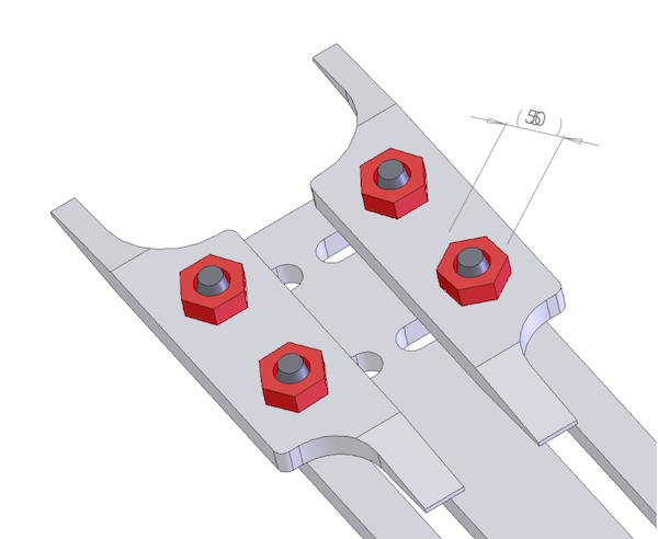 Detailansicht der Klingen am Griff. Rot: Setzmuttern.