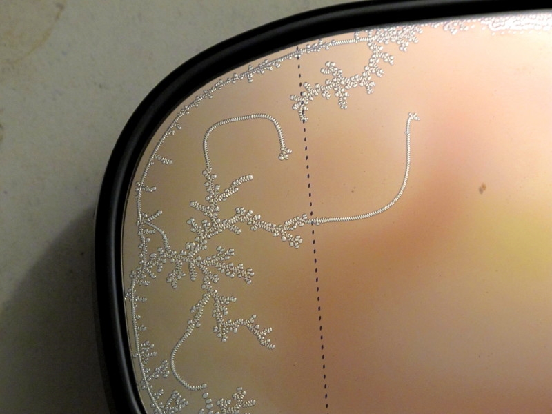 auch ich tippe auf Luft, aber unter einem Klebstreifen ("Tesa-Film etc.) auf Glas.