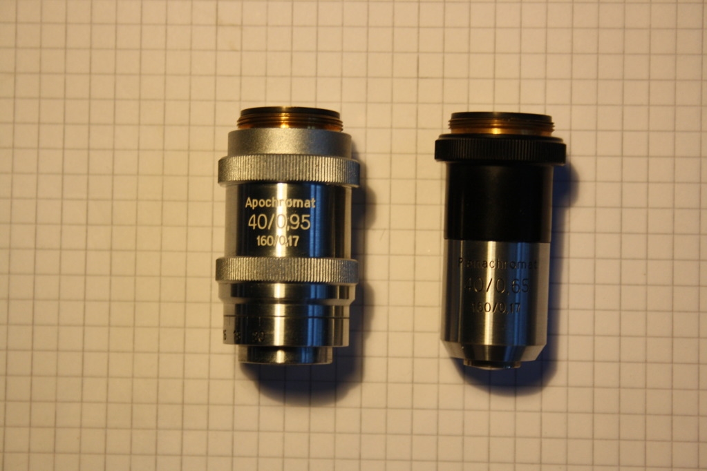 schön sieht man anhand des Linienpapiers bei beiden Objektiven eine Baugröße > 45mm, also sind beide Objektive auch für Abgleichlänge 45mm...daran kann es also nicht liegen. Hast Du mal am Apochromaten den Einstellring für die Deckglaskorrektur bewegt und korrekt eingestellt? Die Skala geht von 12 - 20 und der Pfeil sollte bei 17 stehen, dann ist die Korrektur für Deckgläser von 0,17mm Dicke richtig. Ohne Deckglas ergibt sich bei der hohen Apertur und Abbildungsmassstab natürlich auch kein brauchbares Bild mehr. Außerdem sollte sich der vordere Objektivteil vom Apochromaten ungefähr 1,5mm einfedern lassen, wenn das Objektiv in Ordnung ist (Präparateschutz).