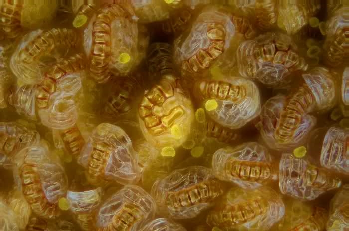 Die wurmartigen Gebilde auf der Gesamtansicht sind die Anuluszellen. Sie trockenen einseitig aus und wenn die dadurch entstehende Spannung hoch genug ist, reißt das Sproangium auf und die Sporen werden herausgeschleudert. Die Relation zwischen Anuluszellen und Spore war bei meiner Cyatheenprobe ähnlich wie bei Deiner.