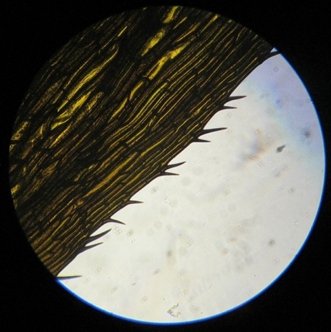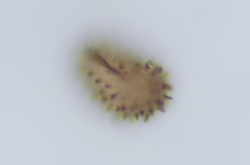 Sind zwar keine Sporen aber eine Schuppe einer Cyathea medullaris. Die Stacheln die man sieht sind übrigens durchaus von praktischer Relevanz. Wenn man den Wedeln der Cyatheen zu nahe kommt, dann brechen die Stacheln der Schuppen sehr leicht ab und es juckt fasst wie Juckpulver. Bei der Cyathea medullaris ist das allerdings nicht so ausgerägt. Es gibt Arten mit viel deutlicheren Stacheln. Eine Schuppe ist ca. 2cm lang. Das letzte Bild zeigt einen sich entrollenden Wedel. Die "Borsten" (die selbst eigentlich ganz weich sind) sind die Schuppen von denen eine unterm Mikroskop lag.