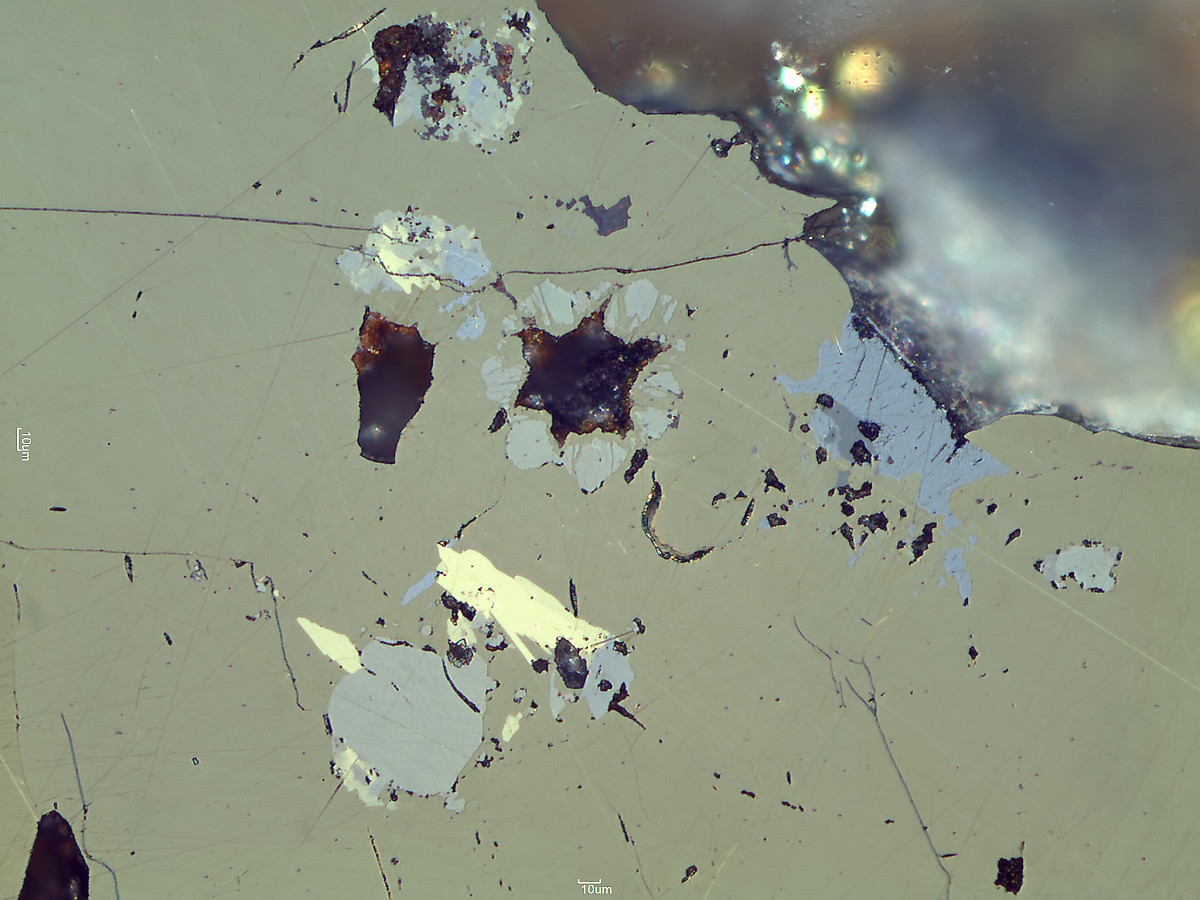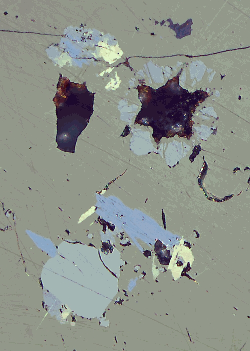 Während der Kupferkies und das Pyritkorn unten im Bild bei +/- Wechsel von 5 Grad aus der Kreuzstellung der Polarisatoren die Farbe kaum ändern, zeigt der anisotrope Millerit einen schönen Farbwechsel von blau nach gelb.