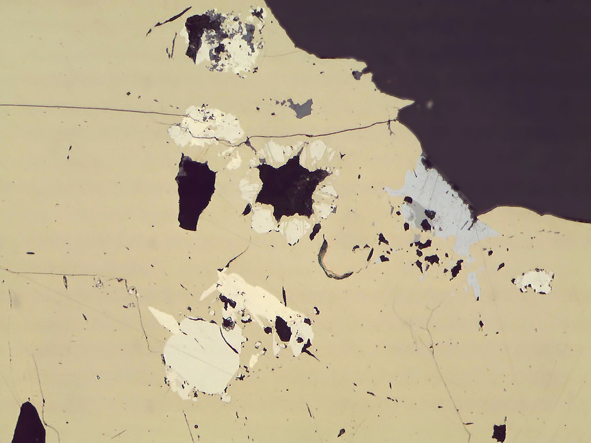 bei stärker gekreuzten Polarisatoren sieht man die von Dir beschriebenen Farben schon , allerdings immer noch schwach. Wahrscheinlich hängt das Farbspiel der Anisotropie auch von der Orientierung des Kupferkieses zu den Polarisatoren ab, ich werde den Schliff mal auf dem Tisch drehen, ich habe das Foto ja mit fest auf dem Tisch orientiertem Schliff gemacht.