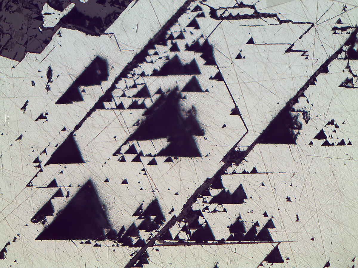 Man erkennt auf diesem Bild sehr eindrucksvoll die manchmal auftretenden dreieckigen Schleifausbrüche deren Form in der Galenit-Kristallstruktur bedingt sind.
