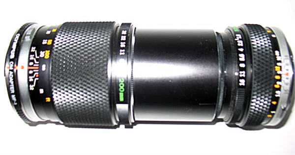 Beispiel im Bild: Olympus E-420 mit altem Olympus-OM-Tele 5/200mm (angeschlossen mit zugehörigem OM-Adapter); davor in Retro-Stellung das OM 1,8/50mm (beide haben 49mm-Filtergewinde und lassen sich mittels eines zweiseitigen 49mm-Gewinderinges problemlos aneinander schrauben).